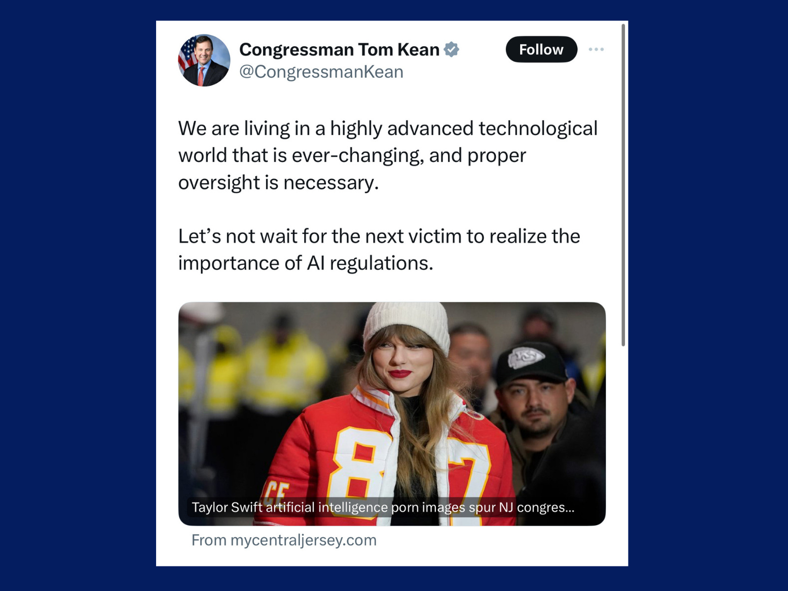 Republican Rep. Tom Kean of New Jersey tweeted, “Let’s not wait for the next victim to realize the importance of AI regulations.”