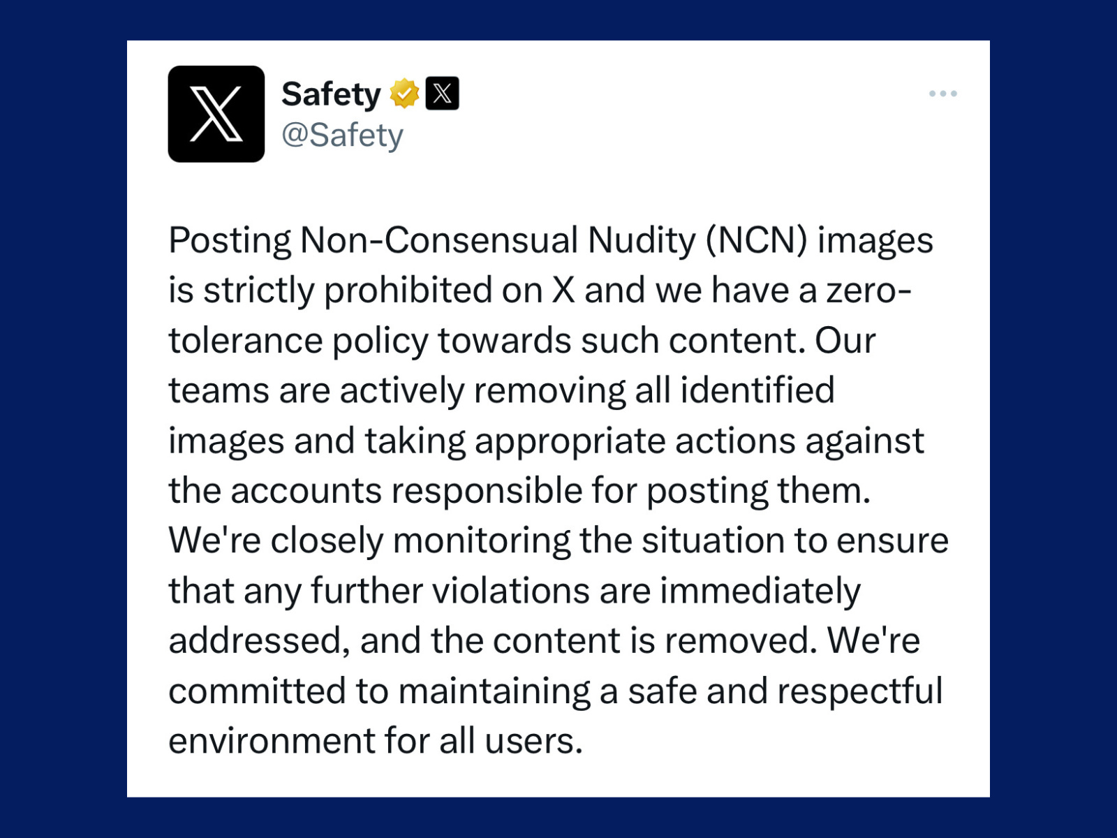 In a statement, X said it was "actively removing" the images and taking "appropriate actions" against the accounts involved in spreading them, adding, “We're closely monitoring the situation to ensure that any further violations are immediately addressed, and the content is removed."